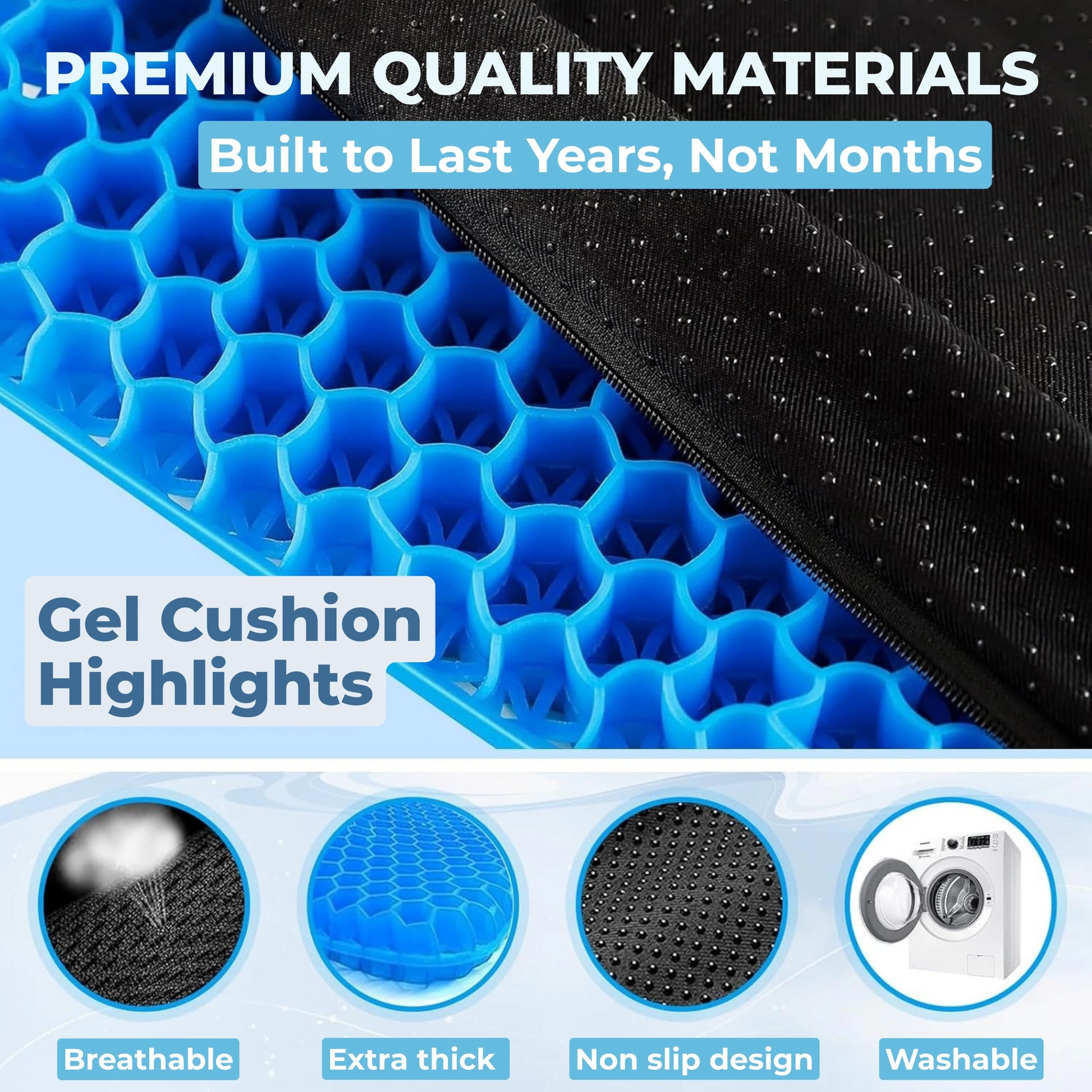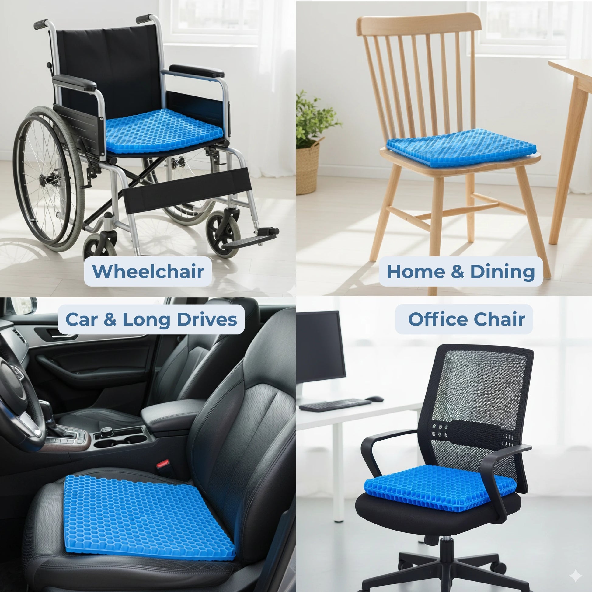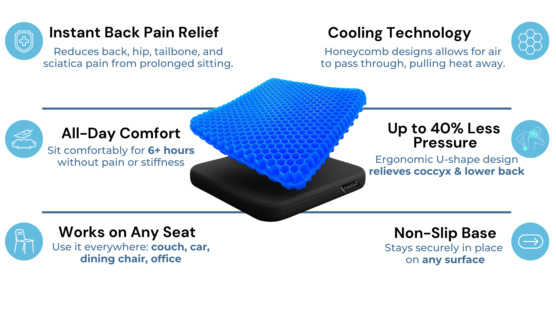 Sit for 6+ hours without fidgeting or numbness. Cooling gel stays comfortable during long work sessions or drives.