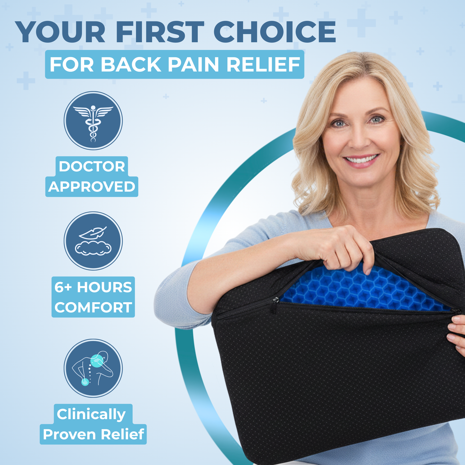Office, car, home, wheelchair. One cushion transforms every seat. Portable, lightweight, ready to go.